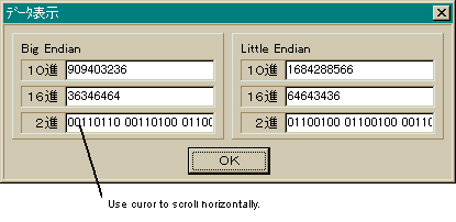 When the cursor is in the binary dump area, please input with a hexadecimal number. When the cursor is in the character dump area, please input with a character string.