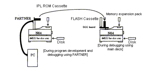 The types of configurations shown in Fig. 1 of the next page should be used during program development and debugging on the N64. In the latter case, the special development IPL should be written to the flash cassette for use. During program development, executing the resetdd command in the Partner Command window automatically transfers the development IPL to emulation ROM and executes it.