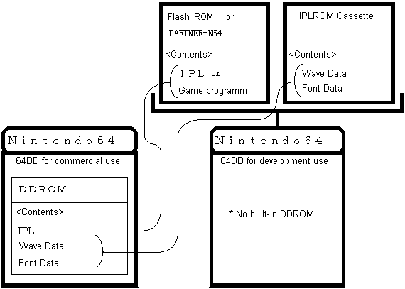 As is implied by the fact that it is transferred to emulation ROM for use, the special development IPL is placed at the usual address of the ROM cartridge. Although this differs from the address where DDROM is located, this has no effect on development. (See Chapter 4.). It is font and wave data for which special consideration is required. To access these data in the same manner as data in the built-in DDROM of the commercial drive, the IPL cassette in the N64DD development system must be used as shown in Figure 1. The board of this IPL ROM cassette contains the same data as in the built-in DDROM of the commercial drive.