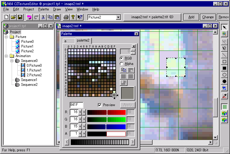 (The current version only deals with 4bit/8bit CI textures. Accordingly, the palette is restricted to 16bit RGBA/IA.)