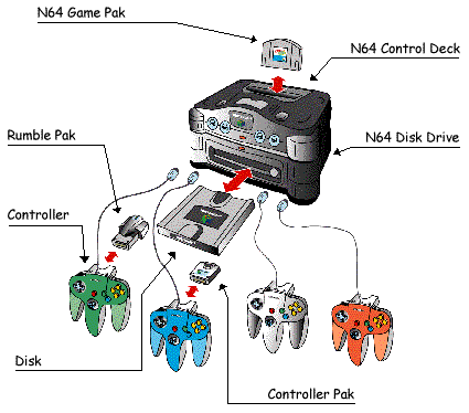 The game software is supplied by an N64 Game Pak and/or an N64 Disk Drive Disk through the parallel interface.
