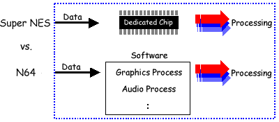 N64 doesn't require a special dedicated chip to process graphics and audio as was the case with Super NES. N64 uses software to execute almost all processes.