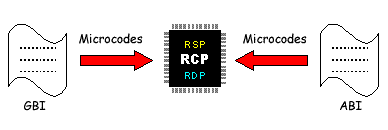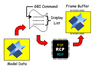 The RSP and RDP work together to execute GBI (Graphics Binary Interface) commands and render graphics into the frame buffer. The GBI commands are strung together into a specialized command list call the display list.
