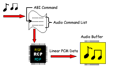 The RSP also interprets ABI (Audio Binary Interface) commands and creates linear PCM data using the sampling rate specified by the audio buffer.