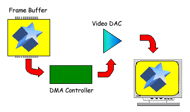 The image drawn in the frame buffer is transferred to the video DAC (Digital-to-Analog Converter) through DMA (direct memory access). The image becomes the TV image in the video DAC.