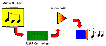 The PCM data placed in the audio buffer is transferred to audio DAC through DMA. The audio becomes sound in the audio DAC.