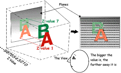 The RDP creates the screen using the Z-buffer (depth buffer) as shown in the following illustration.