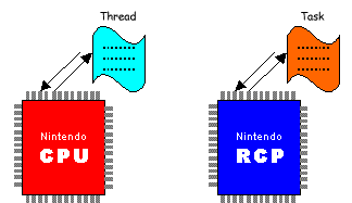 The CPU executes threads comprised of several processing units (function calls,macros, and so on). The RSP in the RCP, on the other hand, executes processing units called tasks.