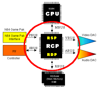 The RCP has two processors (RSP and RDP) and I/O interfaces. The RCP is the most important component of the N64 hardware system as shown in the following illustration. All data passes through the RCP, and the RCP serves as a memory controller for the CPU.