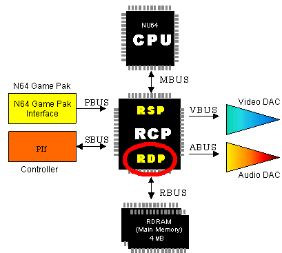 The RDP processes the display list created by the RSP and CPU to create the graphics data. The RDP works only with graphics; it does nothing with audio. In other words, the RDP draws the graphics in the frame buffer and processes several drawing-related operations.