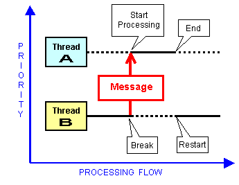 Thread execution order depends on thread priority and the message sending method. Therefore you need to be careful to handle priority differences between a sending thread and a receiving thread. If Thread B, executing a process, sends a message to Thread A which has a higher priority than Thread B, processing moves to Thread A, and Thread B is suspended until Thread A processing has completed. However, for this to work, Thread A must be in the "queued state" waiting for the message from Thread B so that processing can instantly move to Thread A as soon as it gets the message.