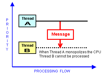Also, be particularly careful when a high-priority Thread A sends a message to a lower-priority Thread B to get a result that Thread A needs to continue its process. If Thread A monopolizes the process, Thread B will not be able to run anything.