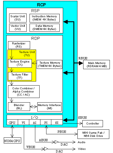 Receive the necessary parameter for drawing from the CPU as the display list and execute the coordinate calculation and the drawing calculation. These drawing processes execute inside of the RCP separating into the following blocks: