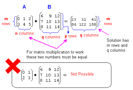 Note that for matrix multiplication to be possible, the number of columns in matrix A (m rows n columns) must equal the number of rows in matrix B (p rows q columns). In other words, n and p in the following illustration must be