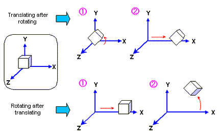 Remember, however, that matrix multiplication is not commutative; that is, you can't switch the order and get the same result. Therefore, when you provide the conversion by using matrices, you need to be careful of the order in which you multiply them. If you multiply in the wrong order, a completely different result will be produced, as shown in the following illustration. Similarly, when you provide several rotational conversions, the result is very different depending on the order of rotating axes. In other words, XYZ will give a result very different from YXZ. This is very important, and you must be careful.
