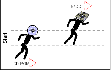 64DD boasts a maximum data transfer rate of 1MByte/sec, which is quick for disk media and about 5.4 times faster than the CD-ROM drives used in other game machines.