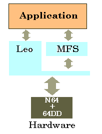 The special Leo Library for 64DD is available as a low-level function library that is closer to the hardware than the MFS that controls the 64DD. The Leo Library is used for disk access by the MFS Library, which is a high-level function library. Also, the Leo Library can be used directly by applications.