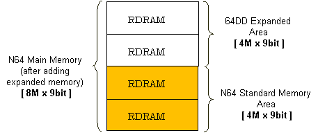 When the 64DD is connected to the N64 Control Deck, the N64's built-in RDRAM is extended by the memory expansion pak that comes with the 64DD system. This doubles the conventional 4M x 9bit of main memory so that 8M x 9-bit of memory can be used as main memory. When creating 64DD applications, this expanded memory area can be allocated for frame buffers and Z buffers in the same way as the standard N64 memory.