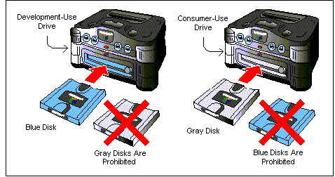There are two types of 64DD drive: One for development use and the other for consumer use. Please note that these two types of drives have their own dedicated disks.