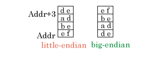 Two different formats for storing data in memory space. The example below shows the two ways the 32 bits of data 0xdeadbeef are stored in memory space. In the little-endian method, data is stored in order from the least significant byte. Conversely, in the big-endian method, data is stored in order from the most significant byte.