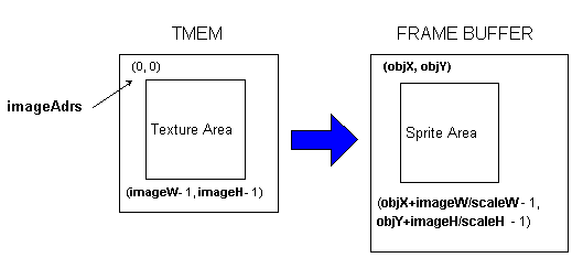 This macro draws a texture in the rectangular area with the upper-left corner screen coordinates (objX, objY) and the lower-right corner screen coordinates (objX+imageW/scaleW-1, objY+imageH/scaleH-1). (See the figure below.) The drawn texture region has its upper-left corner at (0, 0) and its lower-right corner at (imageW-1, imageH-1). When scaleW and scaleH are 1<<10, the texture will be drawn to the same proportions, without scaling.
