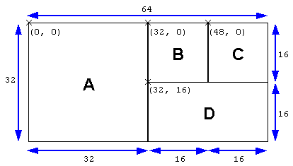 To give a specific example, first prepare a large texture that combines four textures, like that shown in the figure below. Load this as a 64x32 texture, and when actually drawing a sprite, specify each texture as follows: