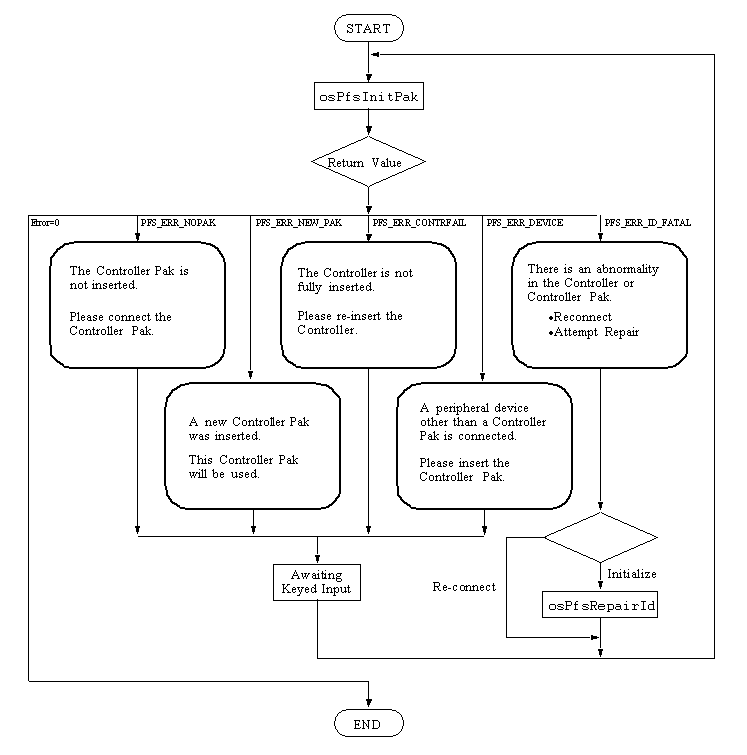 If PFS_ERR_ID_FATAL is returned as the error code, one of the following problems may exist: The Controller Pak's ID area is destroyed, the Controller Pak is not connected properly, the Controller Pak ID cannot be read due to a dirty connector, or the Controller's joy bus or Controller Pak is damaged. In this case, you must display the message, "The Controller or Controller Pak may not be inserted properly, the content may have been destroyed, or it may be damaged." Then prompt the user to choose between "connect again" or "repair it - the content of the Controller Pak may be destroyed.". If the user chooses "connect again," call the osPfsInitPak function again. If the user chooses "repair," call the osPfsRepairId function, and then call osPfsInitPak again.