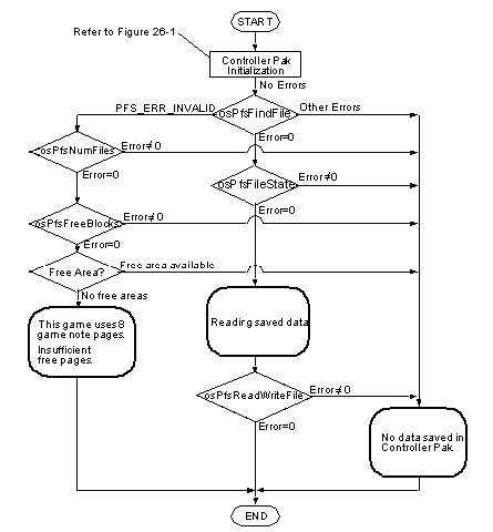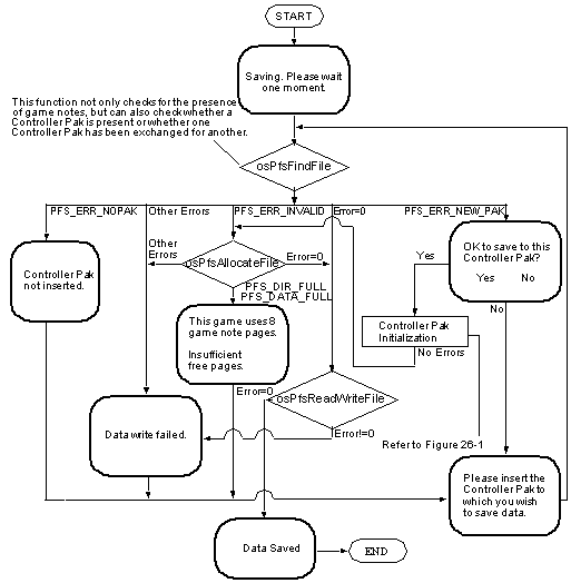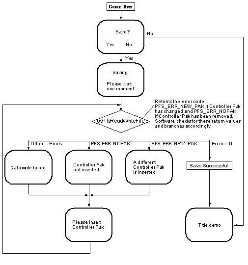 The charts do not, however, cover processing for cases such as removal of the Controller Pak by the user during game play. These possibilities should also be considered. In such cases, responses such as the display of the following message should be implemented, "No Controller Pak. Unable to Save".