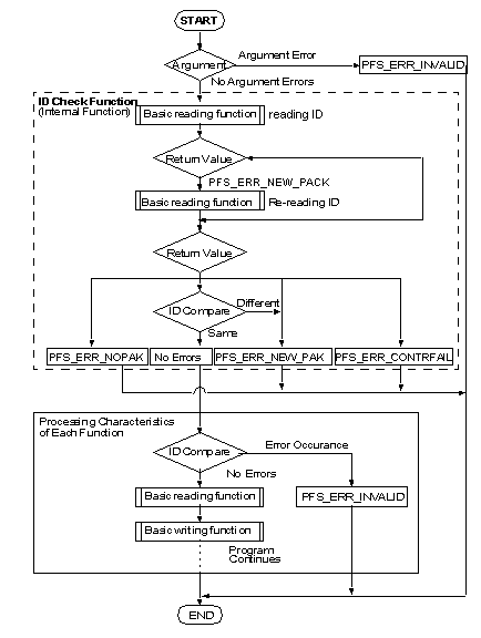 The osPfsInitPak performs the following kinds of processing internally. First it checks the disk ID area. If it recognizes the ID, it calls the function osPfsChecker. This enables recovery to be performed automatically if the file management area (FAT area) is destroyed.