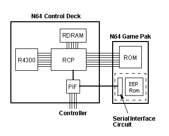 An EEPROM may be built into the N64 Game Pak and used to save data during a game. A circuit is added to the EEPROM so that it can communicate with the serial interface of the RCP.