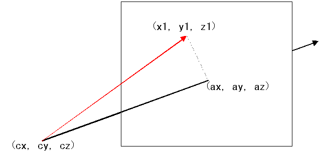 In the figure, the vector c=(cx,cy,cz) is the camera position, the 3D coordinate that you wish to find is x1=(x1,y1,z1), and the vector a=(ax,ay,az) is the ray of a vector from the POV in the viewing direction, which intersects the plane containing the coordinate x1. In addition, since guLookAt or guLookAtF is used to obtain the various vectors - vector Look=(lookX,lookY,lookZ) (the unit direction vector from the POV to the main POV), Up=(upX,upY,upZ) (the unit vector indicating the up direction in the display), and Right=(rightX,rightY,rightZ) (the unit vector indicating the right direction in the display) - they can be utilized to find the coordinate as follows.