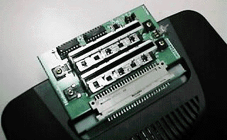 The official item code reads "NUS-DCC KIBAN ASSY". This adapter extends the Game Pak slot of the Nintendo 64 Control Deck into double slots for using an SRAM Pak together with a Flash ROM Pak that doesn't support SRAM. It also has CICs for both PAL and NTSC to help in development for PAL with Partner-N64. It is bundled with the NUD Development System. |