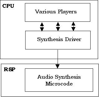 The synthesis driver (henceforth called the synthesizer) calls each pre-registered player and the players interpret the data. There are some restrictions depending on the kind of synthesizer, but in general a number of players can be registered and used at the same time. Each player ultimately creates an audio command list and passes it on to the audio synthesis microcode (henceforth called the audio microcode). The audio microcode then conducts the actual waveform synthesis process. If the audio microcode is different, the synthesizer will also be different.