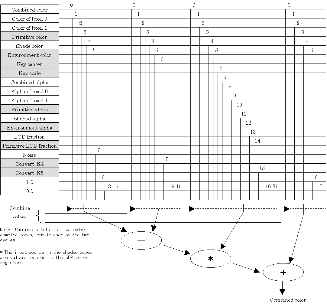 The Combiner, located after the Texture Filter along the RDP pipeline, combines together a number of source colors and source alphas to determine the output color and the output alpha. These output values are then sent to the Blender. In this chapter, we are going to ignore this fact and instead talk as if the output from the Combiner is directly displayed on the screen.