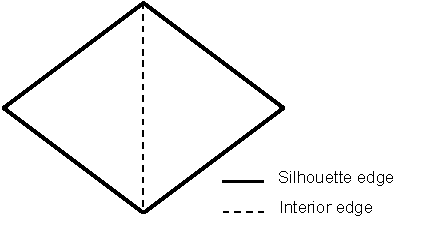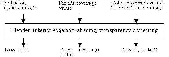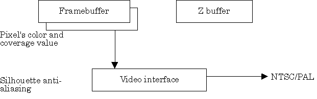 | In this second stage, the silhouette edges of the polygon are anti-aliased. Silhouette edges are all exterior edges of the rasterized polygon. This anti-aliasing process is executed at the stage when data is sent from the framebuffer to the DAC. | |