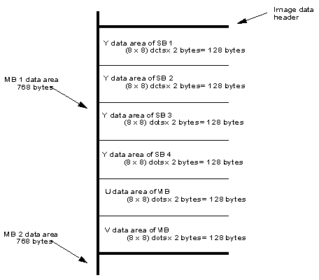 Each macro block must be 768 bytes in size to hold the output data buffer. For example, an image of 320 x 240 dots is divided into a total of 300 MBs. Therefore, a 230,400-byte region is required for the output buffer. Each application must prepare this buffer.