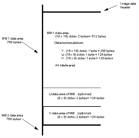 The microcode processes and outputs the image data with a macro block of 16x16 (length x width) dots (pixels). For the mbs argument (the number of all macro blocks), enter the number macro blocks in the original image data. For example, if the size of the original image data is 240x 320 (length x width) dots, the total number of macro blocks should be 300, which is 15 (length) x 20 (width).